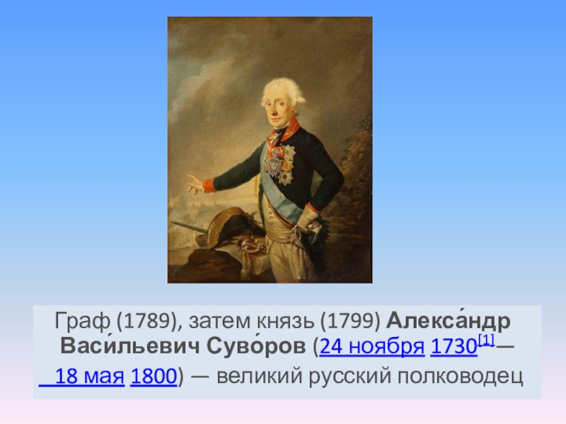 Слайд 6 Граф (1789), затем князь (1799) Алекса́ндр Васи́льевич Суво́ров (24 ноября 1730[1]—