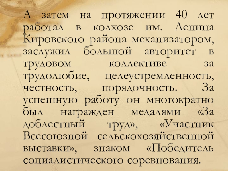 Слайд 12А затем на протяжении 40 лет работал в колхозе им. Ленина