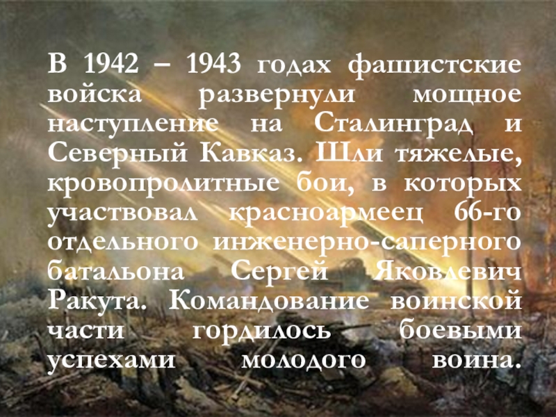 Сталинград и Северный Кавказ. Шли тяжелые, кровопролитные бои, в которых участвовал красноармеец 66-го отдельного инженерно-саперного батальона Сергей Яковлевич Ракута. Командование воинской части гордилось боевыми успехами молодого воина.