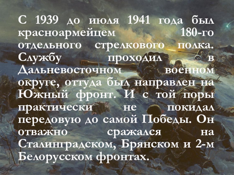 Слайд 9С 1939 до июля 1941 года был красноармейцем 180-го отдельного стрелкового