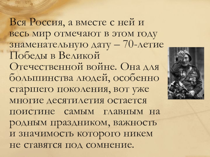в этом году знаменательную дату – 70-летие Победы в Великой Отечественной войне. Она для большинства людей, особенно старшего поколения, вот уже многие десятилетия остается поистине самым главным народным праздником, важность и значимость которого никем не ставятся под сомнение.