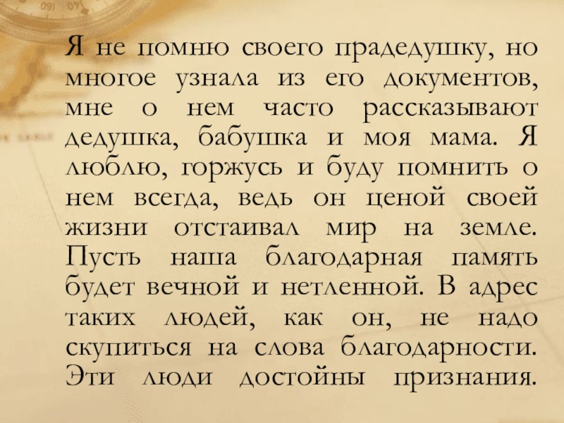Слайд 13Я не помню своего прадедушку, но многое узнала из его документов,