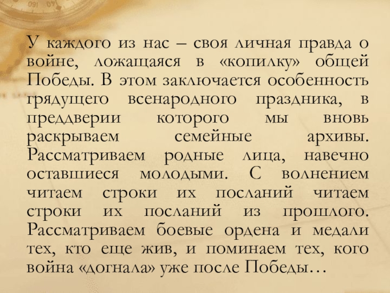 в «копилку» общей Победы. В этом заключается особенность грядущего всенародного праздника, в преддверии которого мы вновь раскрываем семейные архивы. Рассматриваем родные лица, навечно оставшиеся молодыми. С волнением читаем строки их посланий читаем строки их посланий из прошлого. Рассматриваем боевые ордена и медали тех, кто еще жив, и поминаем тех, кого война «догнала» уже после Победы…