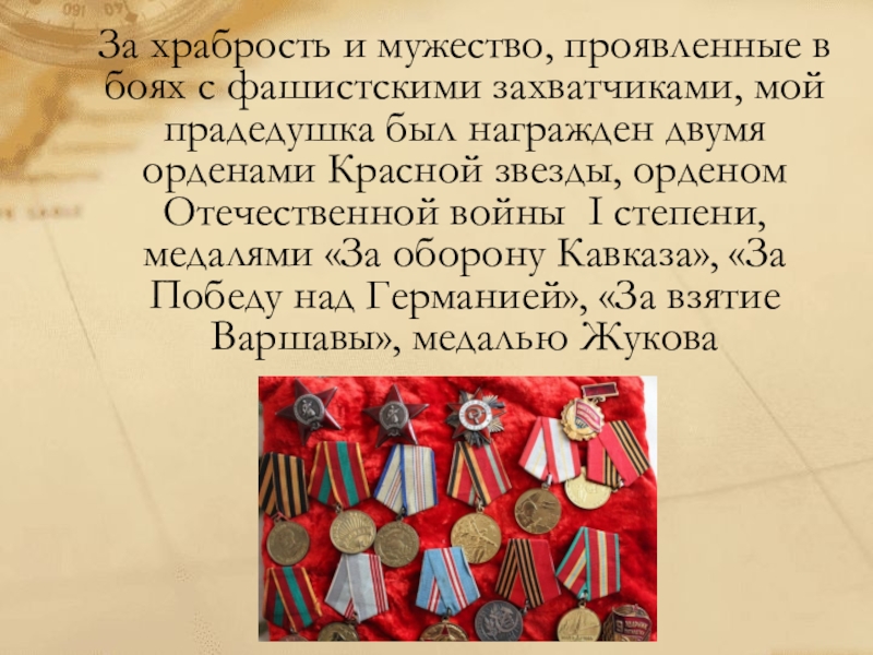 Слайд 11За храбрость и мужество, проявленные в боях с фашистскими захватчиками, мой