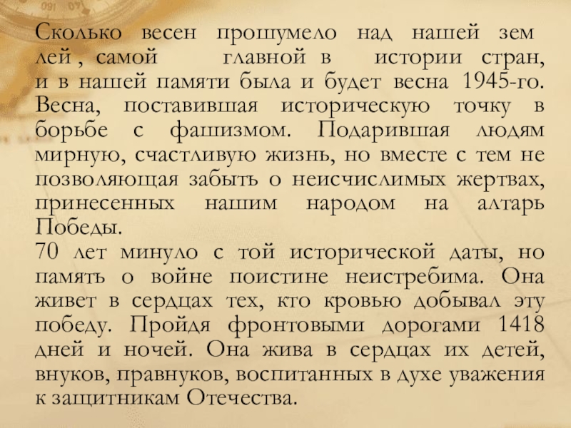 Слайд 5Сколько весен прошумело над нашей землей , самой главной в истории стран, и в нашей памяти