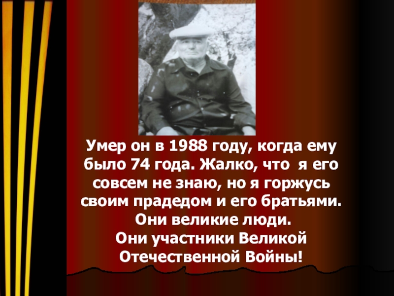 Слайд 9Умер он в 1988 году, когда ему было 74 года. Жалко,