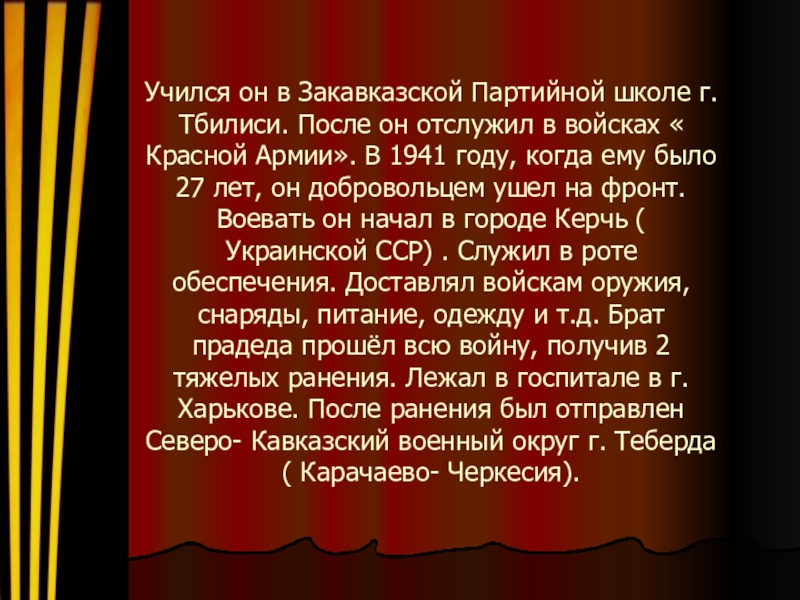 Слайд 5Учился он в Закавказской Партийной школе г. Тбилиси. После он отслужил