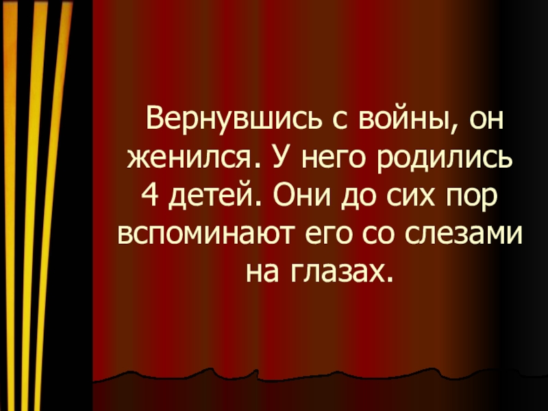 Слайд 8 Вернувшись с войны, он женился. У него родились 4 детей.