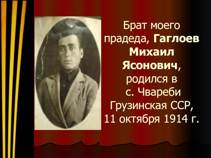 Слайд 4Брат моего прадеда, Гаглоев Михаил Ясонович, родился в с. Чвареби Грузинская