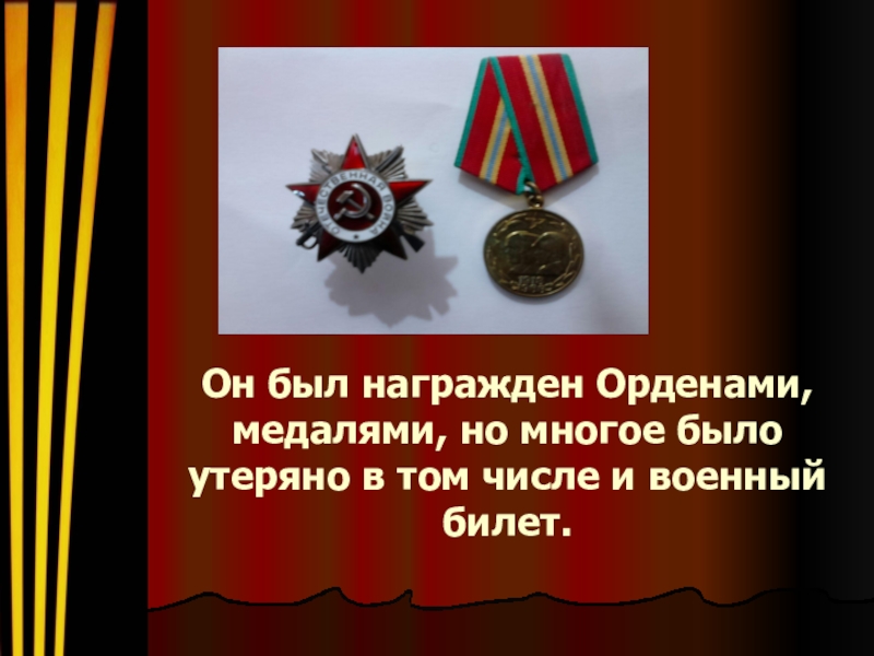 Он был награжден Орденами, медалями, но многое было утеряно в том числе и военный билет.
