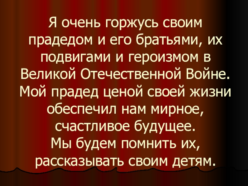 Слайд 11Я очень горжусь своим прадедом и его братьями, их подвигами и