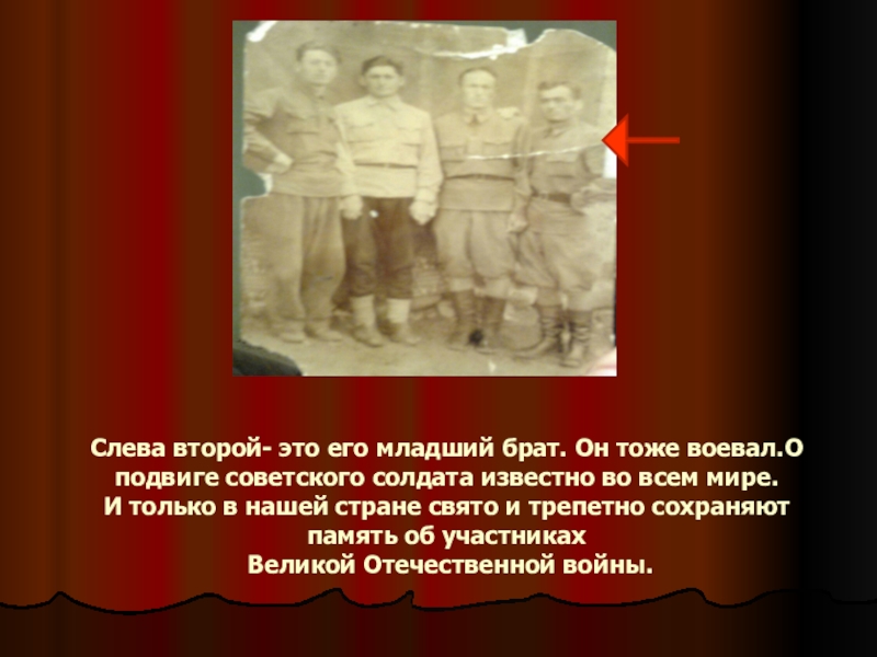 Слайд 10Слева второй- это его младший брат. Он тоже воевал.О подвиге советского