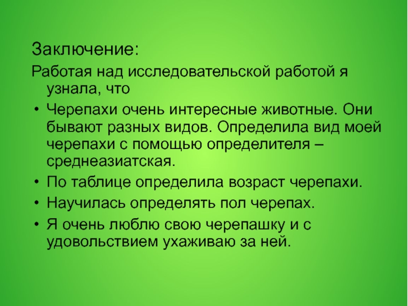 Вывод: длина тела черепахи – 13сантиметров. Значит, моей черепашке 4 года.