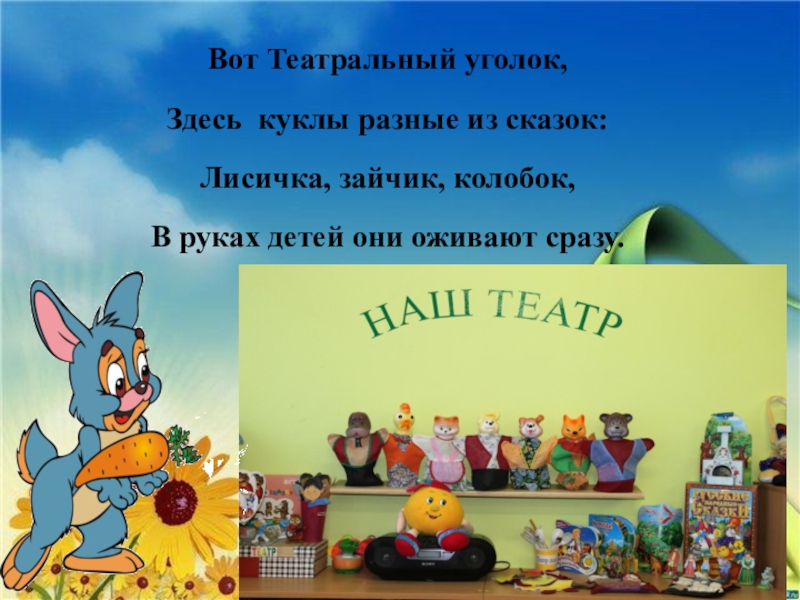 Вот Театральный уголок,Здесь куклы разные из сказок:Лисичка, зайчик, колобок,В руках детей они оживают сразу.