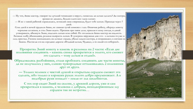 С тех пор сидит Змий на склоне, у древней дороги, уже и сам превратился в камень, а человека с добрым, неподверженным злу сердцем так не встретил…