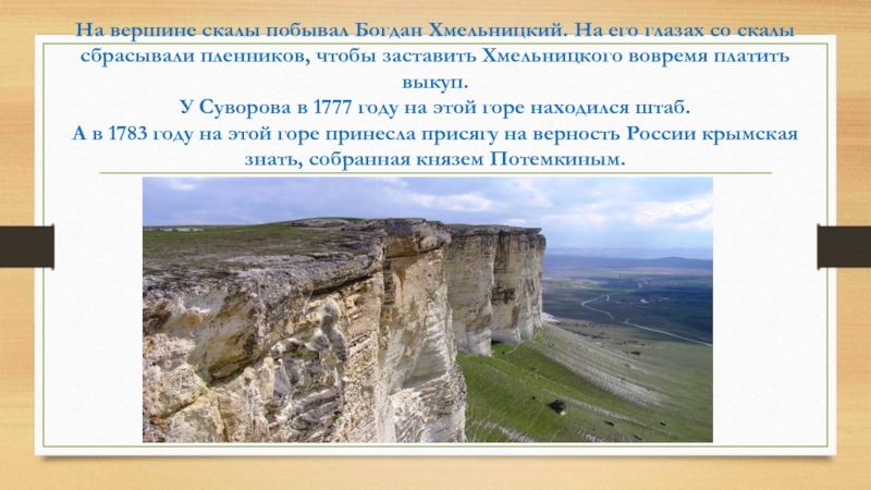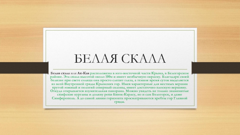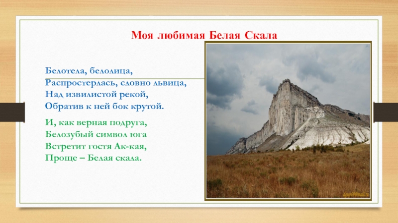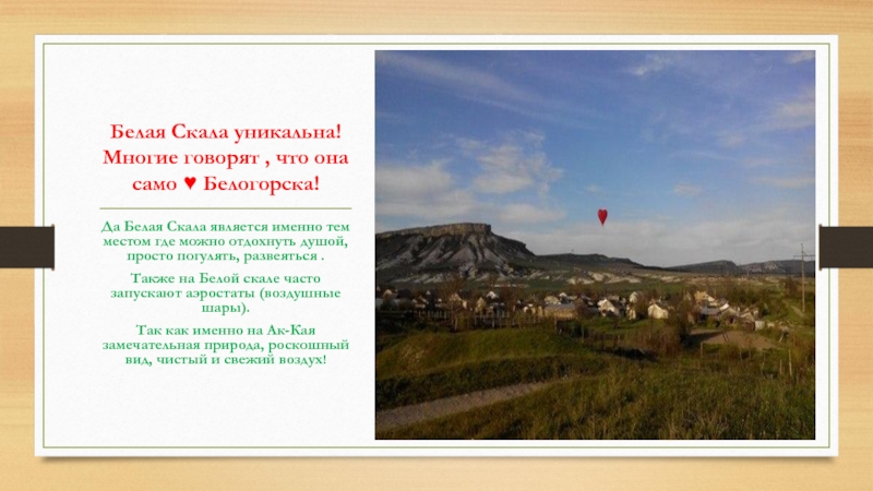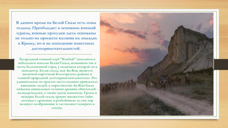 Загородный конный клуб "Ковбой" находится в небольшом поселке Белая Скала, названном так в честь белоснежной горы, у подножья которой он и находится. Белая скала, или Ак-Кая, является визитной карточкой Белогорского района и главной природной достопримечательностью. Это удивительное по красоте место издавна привлекало внимание людей: в окрестностях Ак-Каи были найдены уникальные останки древних обитателей - неандертальцев, а также кости мамонтов. Гроты и пещеры Белой скалы хранят множество тайн: легенды о драконах и разбойниках до сих пор волнуют воображение и заставляют поверить в сказку.