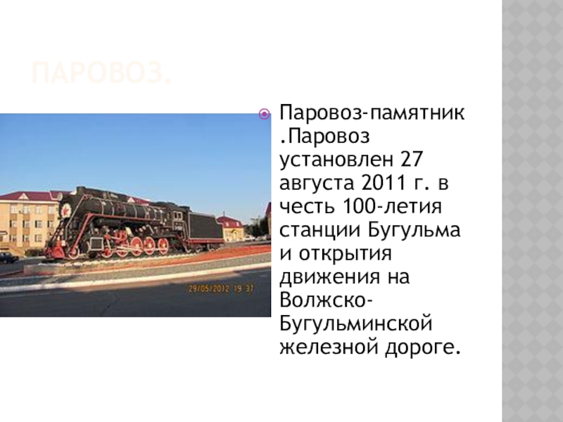 Паровоз.Паровоз-памятник .Паровоз установлен 27 августа 2011 г. в честь 100-летия станции Бугульма и открытия движения на Волжско-Бугульминской железной