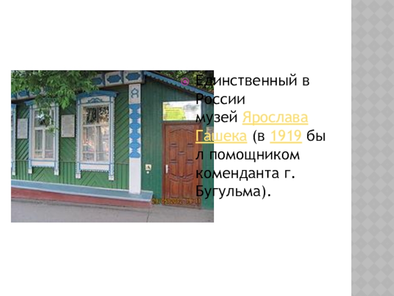 Слайд 10Единственный в России музей Ярослава Гашека (в 1919 был помощником коменданта г. Бугульма).
