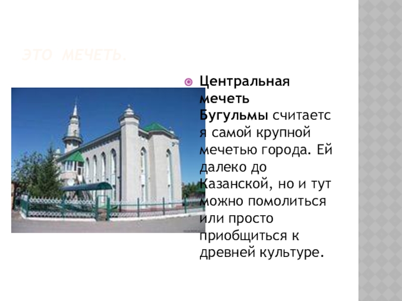 Это мечеть.Центральная мечеть Бугульмы считается самой крупной мечетью города. Ей далеко до Казанской, но и тут можно помолиться или