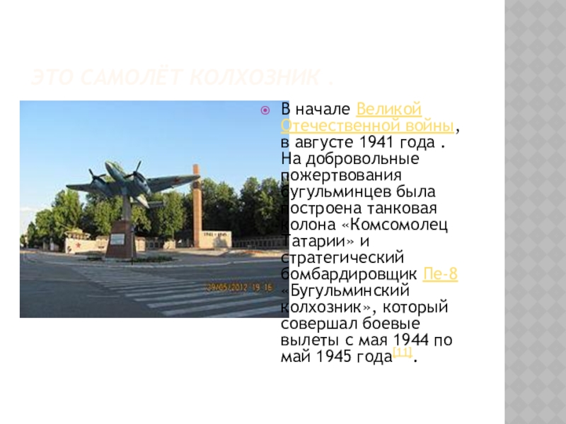 Это самолёт Колхозник .В начале Великой Отечественной войны, в августе 1941 года . На добровольные пожертвования бугульминцев была