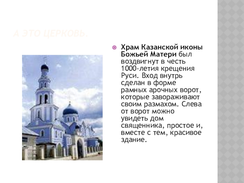 А это церковь.Храм Казанской иконы Божьей Матери был воздвигнут в честь 1000-летия крещения Руси. Вход внутрь сделан в