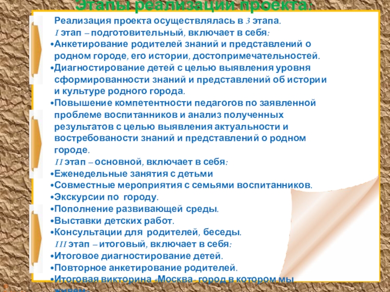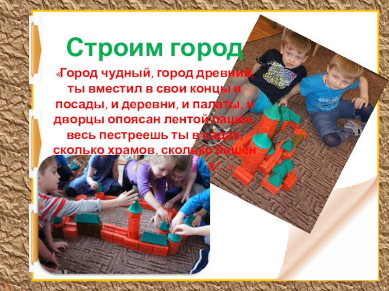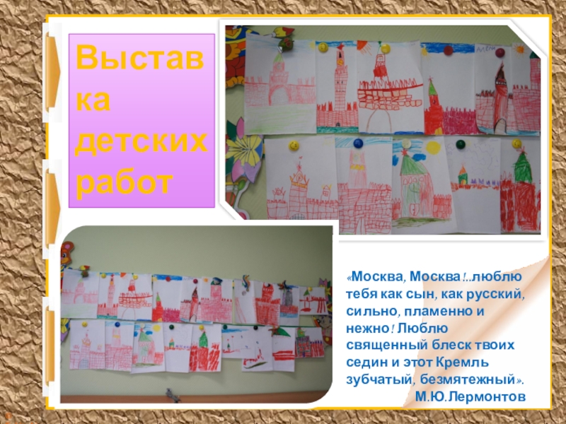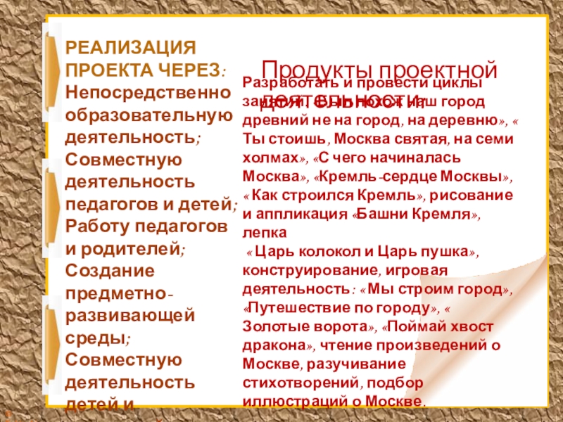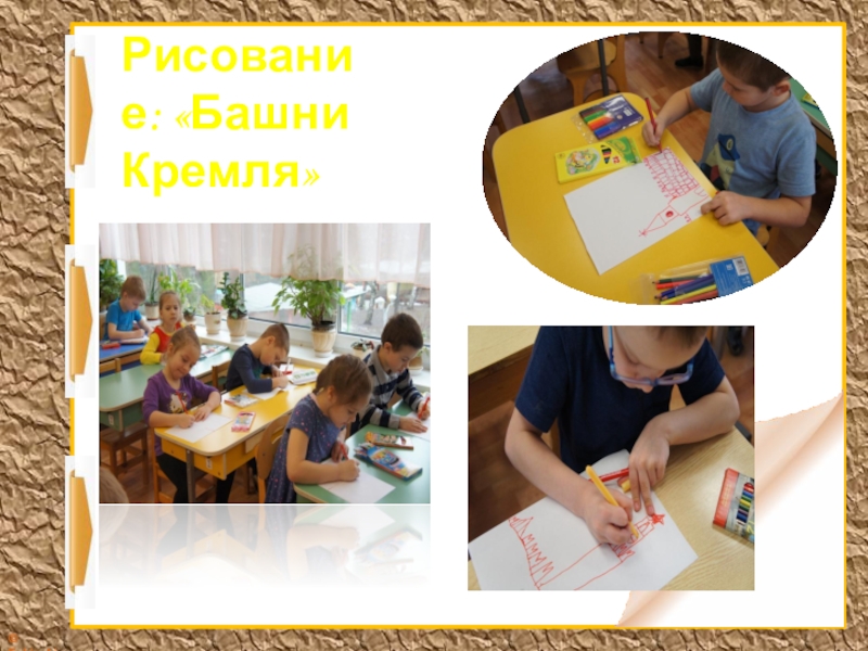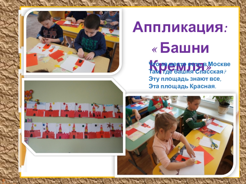 Разработать и провести циклы занятий: «Был похож наш город древний не на город, на деревню», « Ты стоишь, Москва святая, на семи холмах», «С чего начиналась Москва», «Кремль-сердце Москвы», « Как строился Кремль», рисование и аппликация «Башни Кремля», лепка