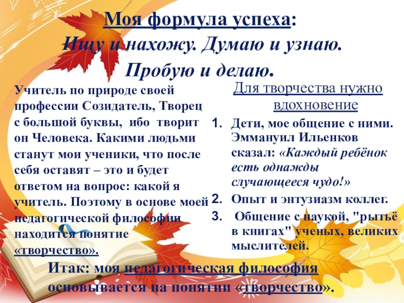 Учитель по природе своей профессии Созидатель, Творец с большой буквы, ибо творит он Человека. Какими людьми станут мои ученики, что после себя оставят – это и будет ответом на вопрос: какой я учитель. Поэтому в основе моей педагогической философии находится понятие «творчество».