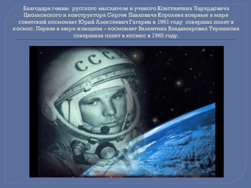 Сергея Павловича Королева впервые в мире советский космонавт Юрий Алексеевич Гагарин в 1961 году совершил полет в космос. Первая в мире женщина – космонавт Валентина Владимировна Терешкова совершила полет в космос в 1963 году.