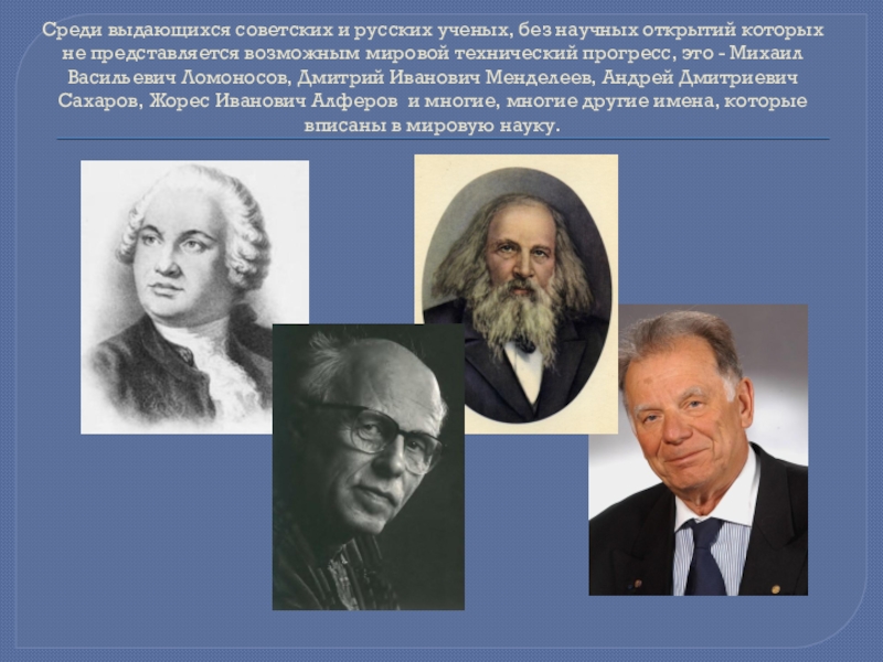 представляется возможным мировой технический прогресс, это - Михаил Васильевич Ломоносов, Дмитрий Иванович Менделеев, Андрей Дмитриевич Сахаров, Жорес Иванович Алферов и многие, многие другие имена, которые вписаны в мировую науку.