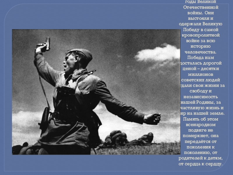 врагами наши деды и отцы в годы Великой Отечественной войны. Они выстояли и одержали Великую Победу в самой кровопролитной войне за всю историю человечества. Победа нам досталась дорогой ценой – десятки миллионов советских людей отдали свои жизни за свободу и независимость нашей Родины, за счастливую жизнь и мир на нашей земле. Память об этом всенародном подвиге не померкнет, она передаётся от поколения к поколению, от родителей к детям, от сердца к сердцу.