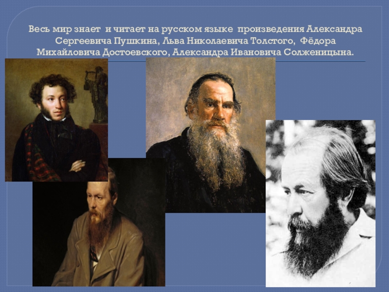 Пушкина, Льва Николаевича Толстого, Фёдора Михайловича Достоевского, Александра Ивановича Солженицына.