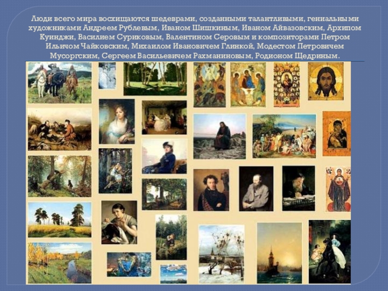 Слайд 10Люди всего мира восхищаются шедеврами, созданными талантливыми, гениальными художниками Андреем Рублевым,