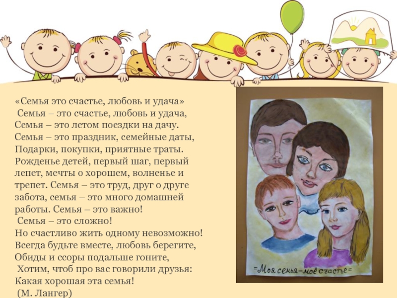 Семья – это праздник, семейные даты, Подарки, покупки, приятные траты. Рожденье детей, первый шаг, первый лепет, мечты о хорошем, волненье и трепет. Семья – это труд, друг о друге забота, семья – это много домашней работы. Семья – это важно!