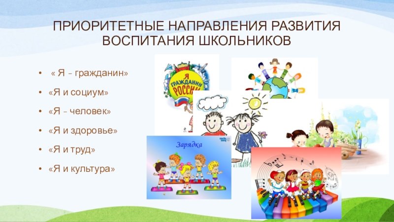 ПРИОРИТЕТНЫЕ НАПРАВЛЕНИЯ РАЗВИТИЯ ВОСПИТАНИЯ ШКОЛЬНИКОВ « Я - гражданин»«Я и социум»«Я - человек»«Я и здоровье»«Я и труд»«Я