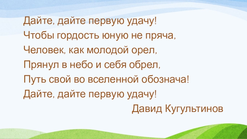 Дайте, дайте первую удачу!Чтобы гордость юную не пряча,Человек, как молодой орел,Прянул в небо и себя обрел,Путь свой