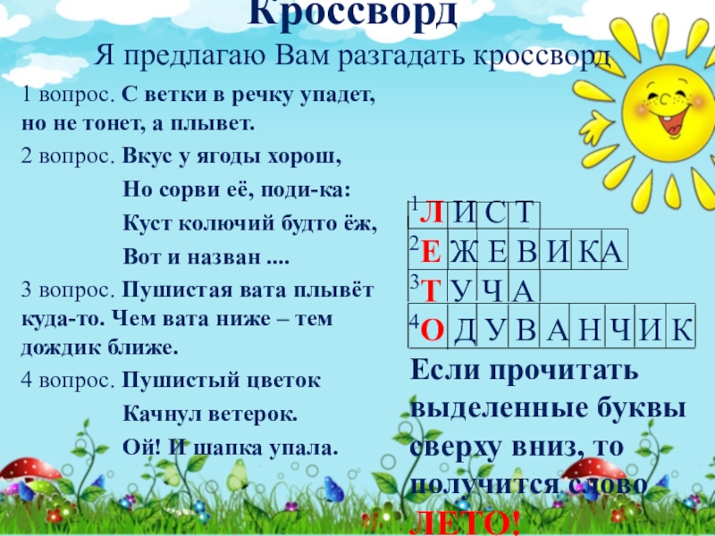 Если прочитать выделенные буквы сверху вниз, то получится слово ЛЕТО!