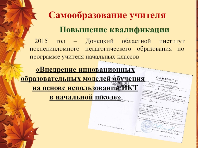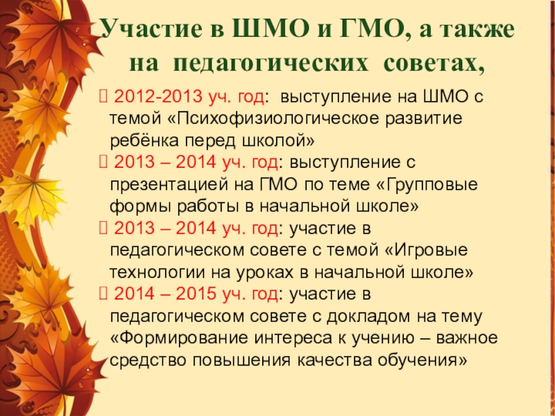2013 – 2014 уч. год: выступление с презентацией на ГМО по теме «Групповые формы работы в начальной школе»