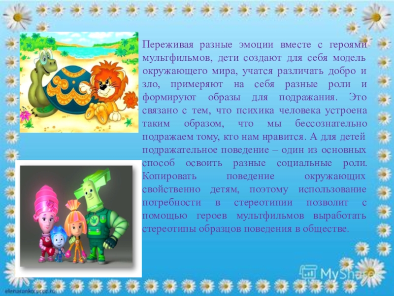 Слайд 5Переживая разные эмоции вместе с героями мультфильмов, дети создают для себя