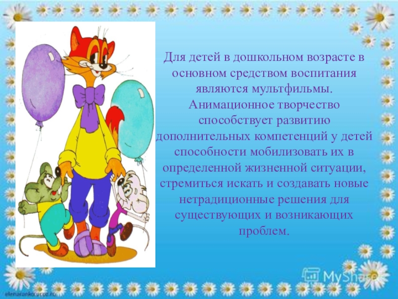 Для детей в дошкольном возрасте в основном средством воспитания являются мультфильмы. Анимационное творчество способствует развитию дополнительных компетенций