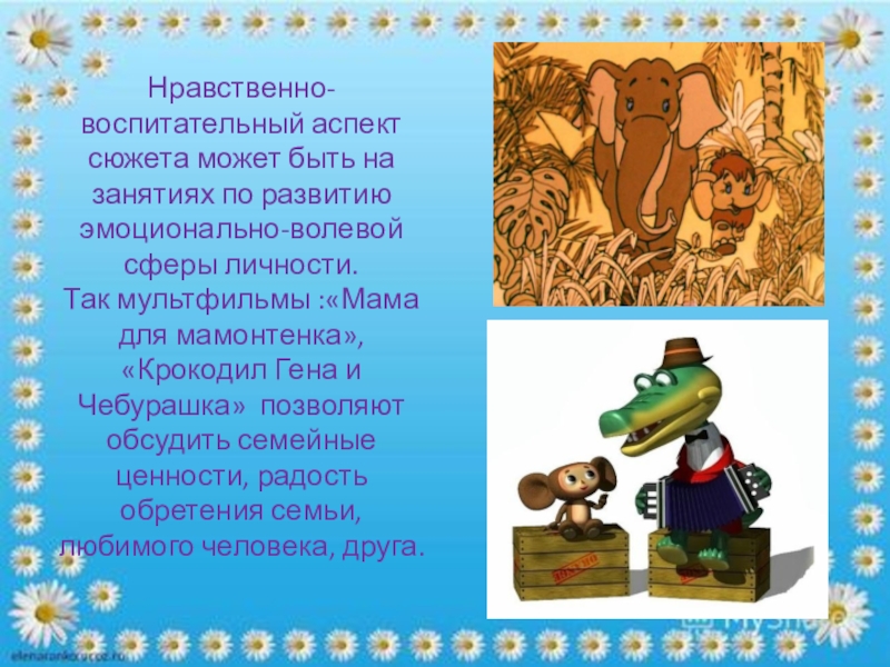 мультфильмы :«Мама для мамонтенка», «Крокодил Гена и Чебурашка»  позволяют обсудить семейные ценности, радость обретения семьи, любимого человека, друга.