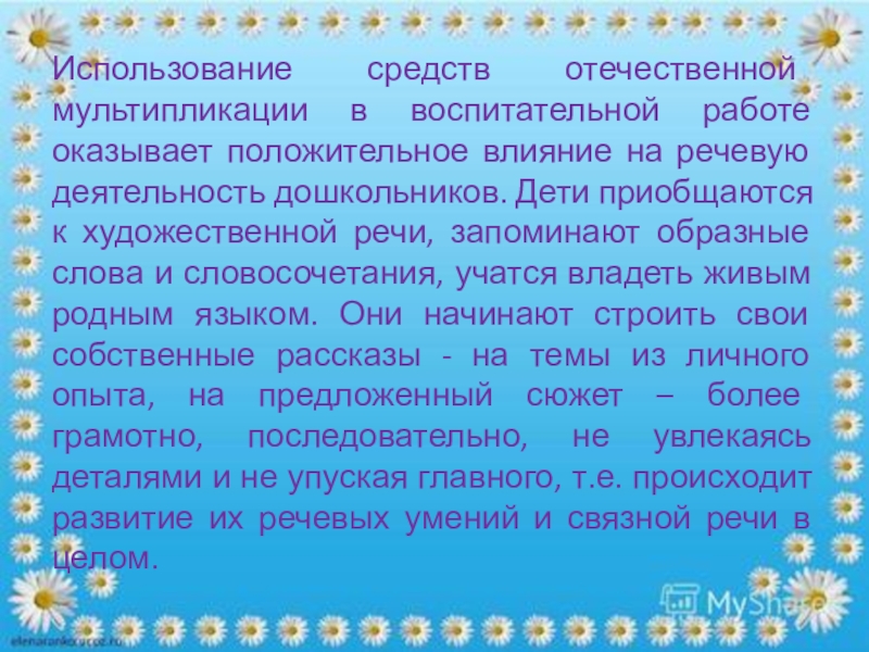 Использование средств отечественной мультипликации в воспитательной работе оказывает положительное влияние на речевую деятельность дошкольников. Дети приобщаются к