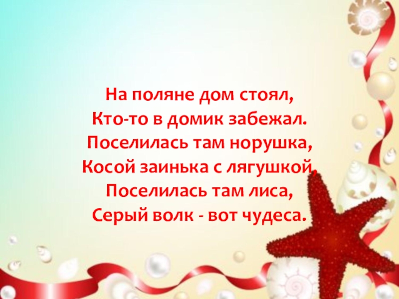 На поляне дом стоял,Кто-то в домик забежал.Поселилась там норушка,Косой заинька с лягушкой,Поселилась там лиса,Серый волк - вот