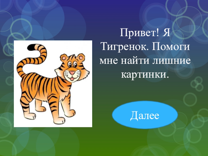 Привет! Я Тигренок. Помоги мне найти лишние картинки.Далее