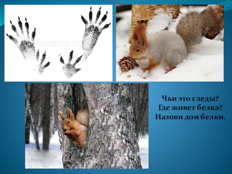 Чьи это следы?Где живет белка?Назови дом белки.