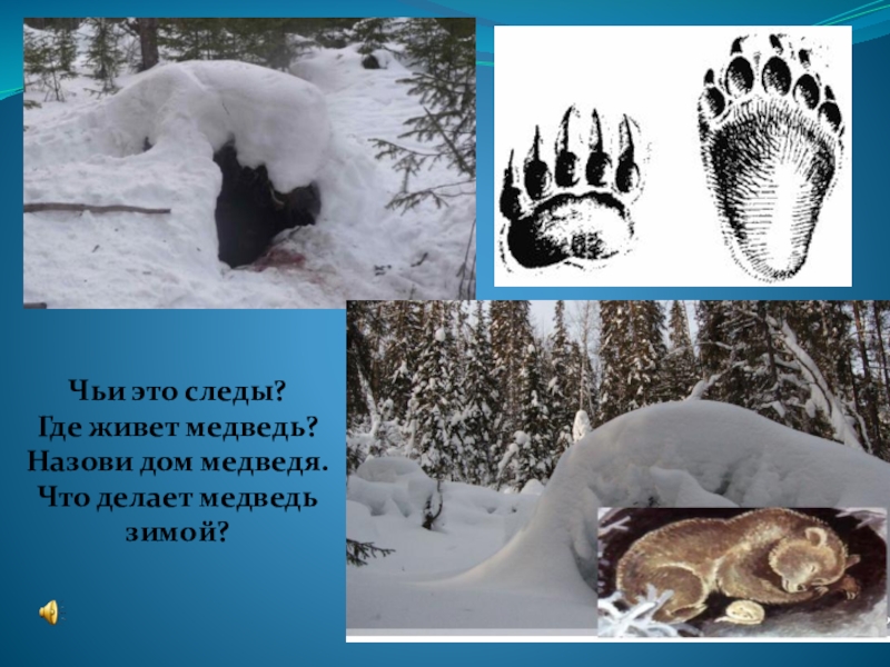 Чьи это следы?Где живет медведь?Назови дом медведя.Что делает медведь зимой?