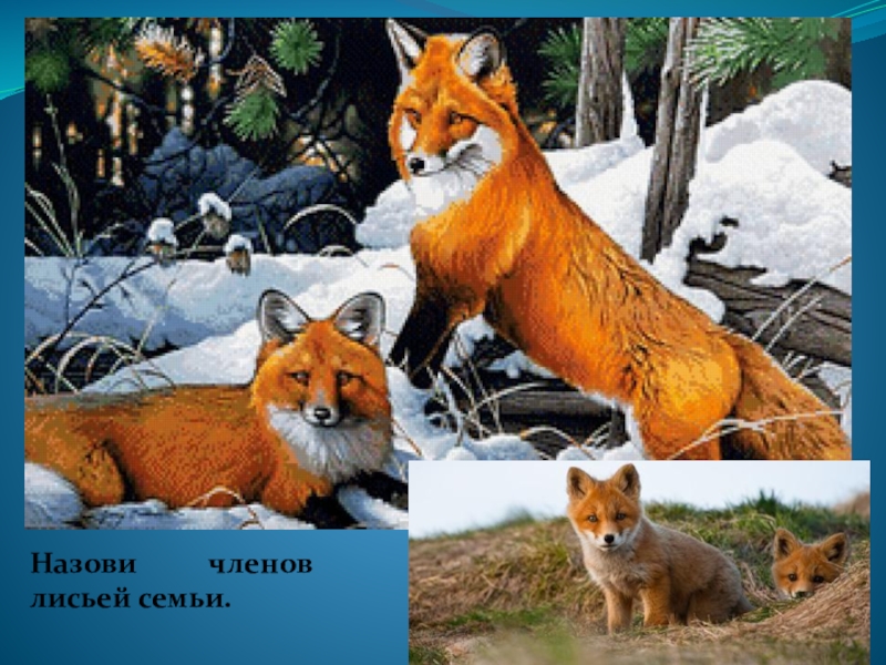 Слайд 6Назови членов лисьей семьи.