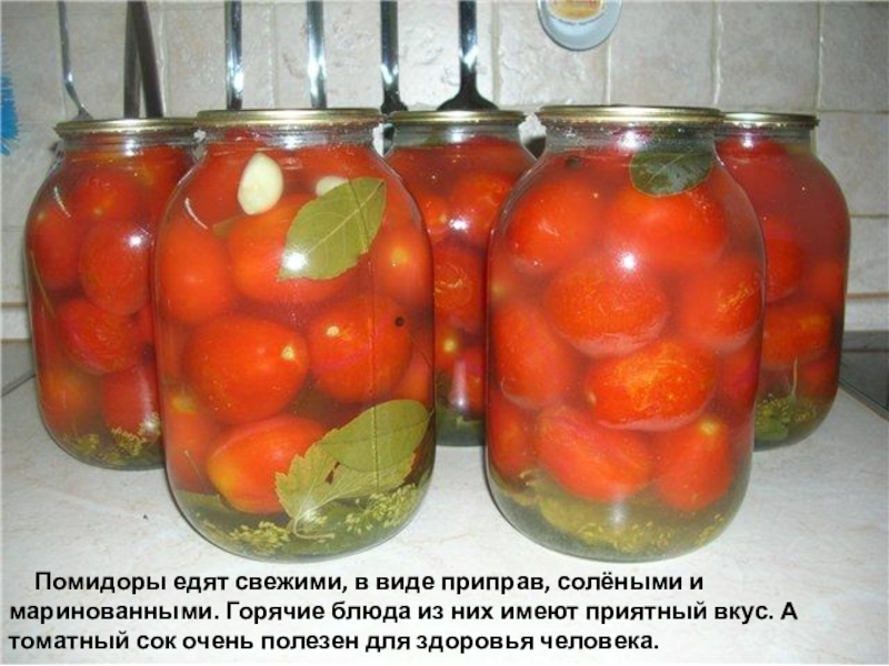 блюда из них имеют приятный вкус. А томатный сок очень полезен для здоровья человека.