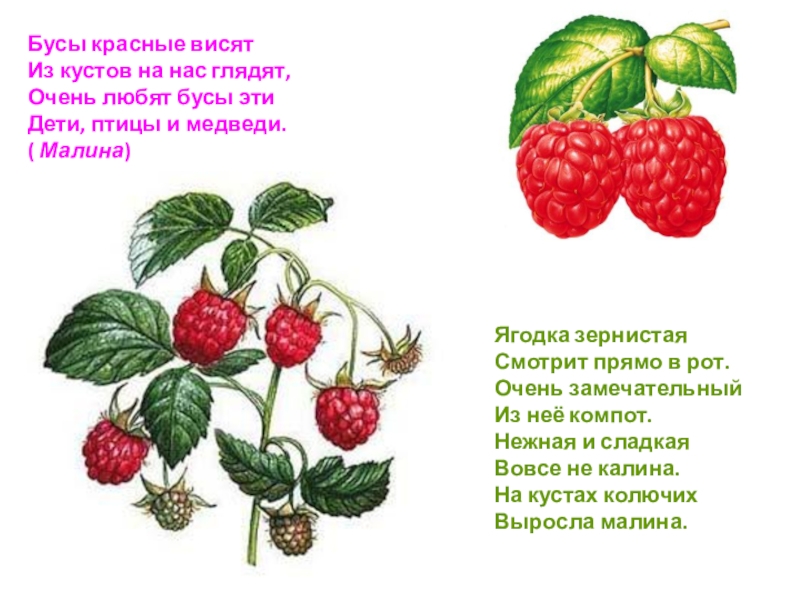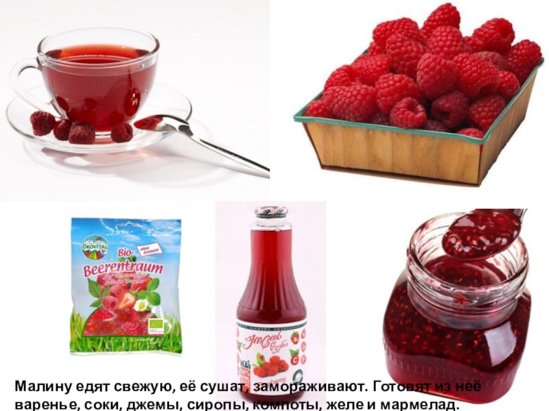 Слайд 158Малину едят свежую, её сушат, замораживают. Готовят из неё варенье, соки,