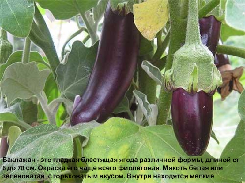 Слайд 19Баклажан - это гладкая блестящая ягода различной формы, длиной от 6