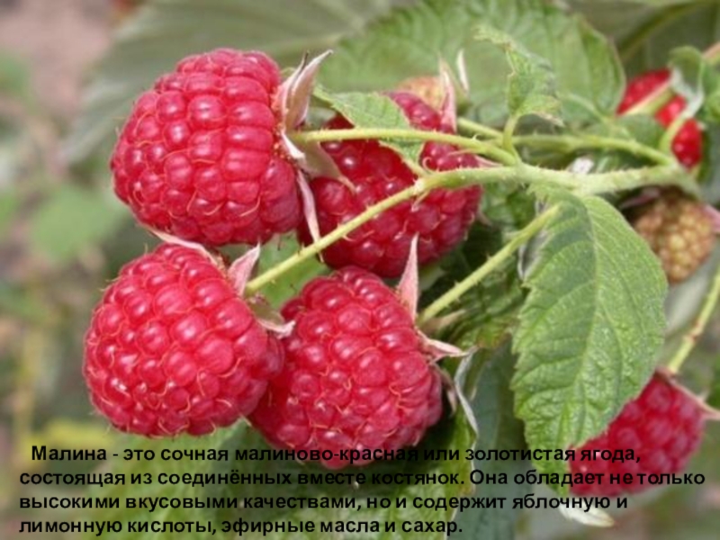 Слайд 156 Малина - это сочная малиново-красная или золотистая ягода, состоящая из